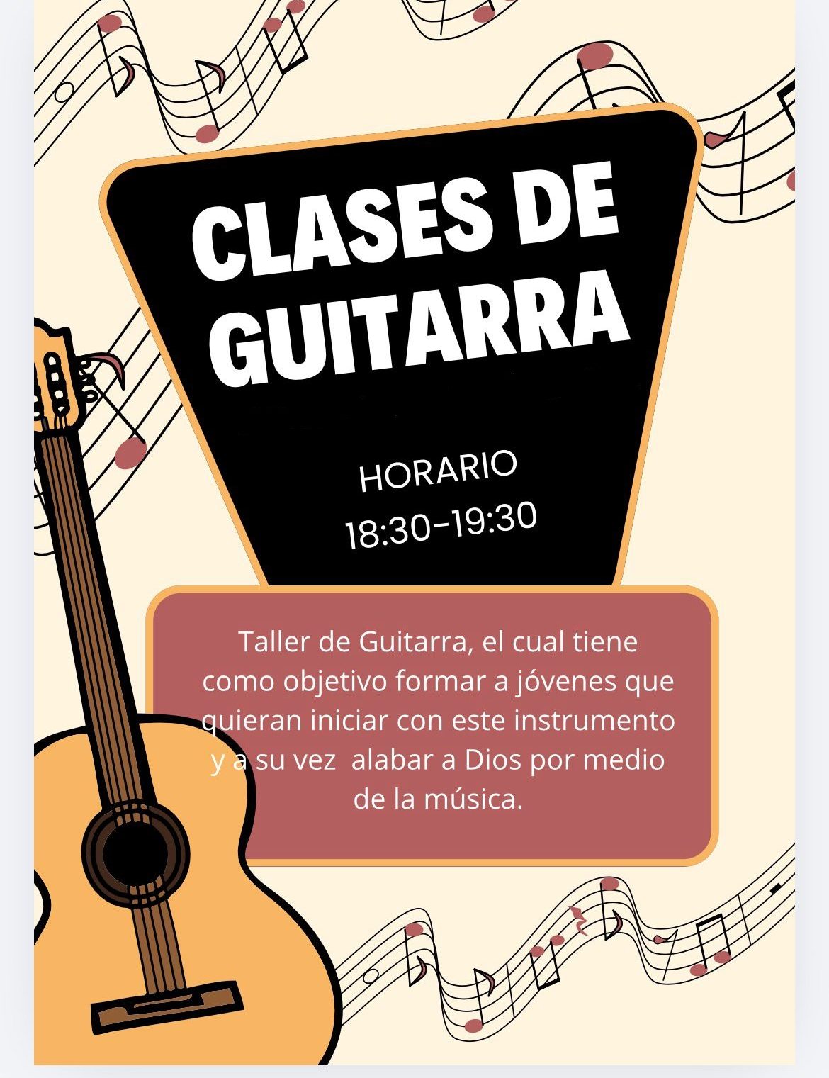 Taller de Guitarra, el cual tiene como objetivo formar a jóvenes que quieran iniciar con este instrumento y a su vez alabar a Dios por medio de la música.